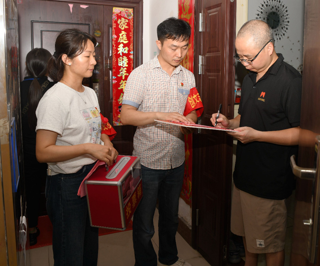 6月13日,株洲市交通事务中心10余名党员志愿者,和芦淞区庆云街道南湖塘社区工作人员一起,在金碧花园小区上门入户开展业主换届选举投票工作。
