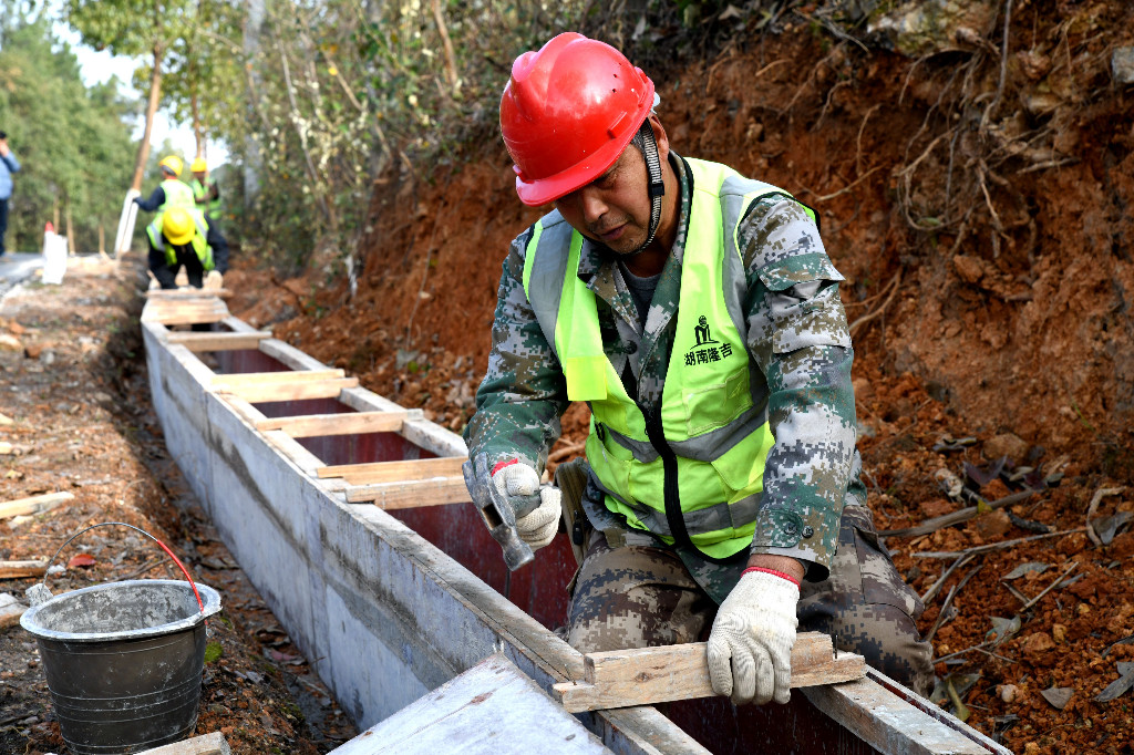 1月11日,施工人员在S207线淦田段公路中修工地浆砌水沟,标志着全市100公里普通公路中修工程即将竣工。