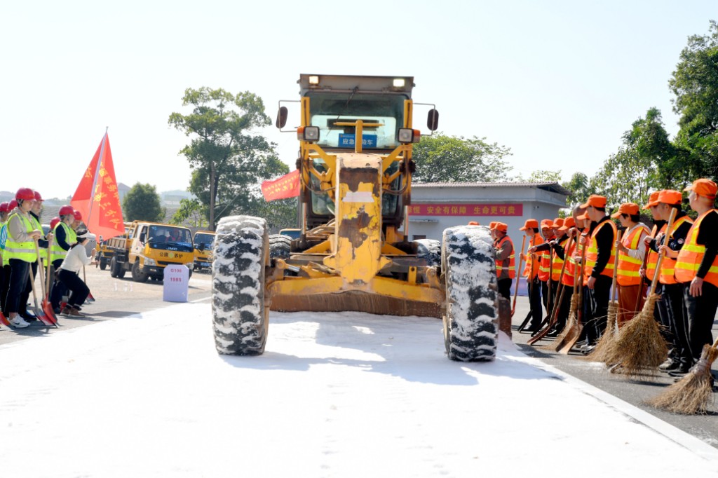 活动现场,破冰机、平地机、撒盐机、装载机、运输机整齐排列,140名应急除雪工作人员整装待发。随着市交通事务中心党委书记、主任钟勇军一声令下,扫雪除冰应急模拟演练正式开始。