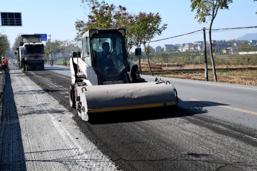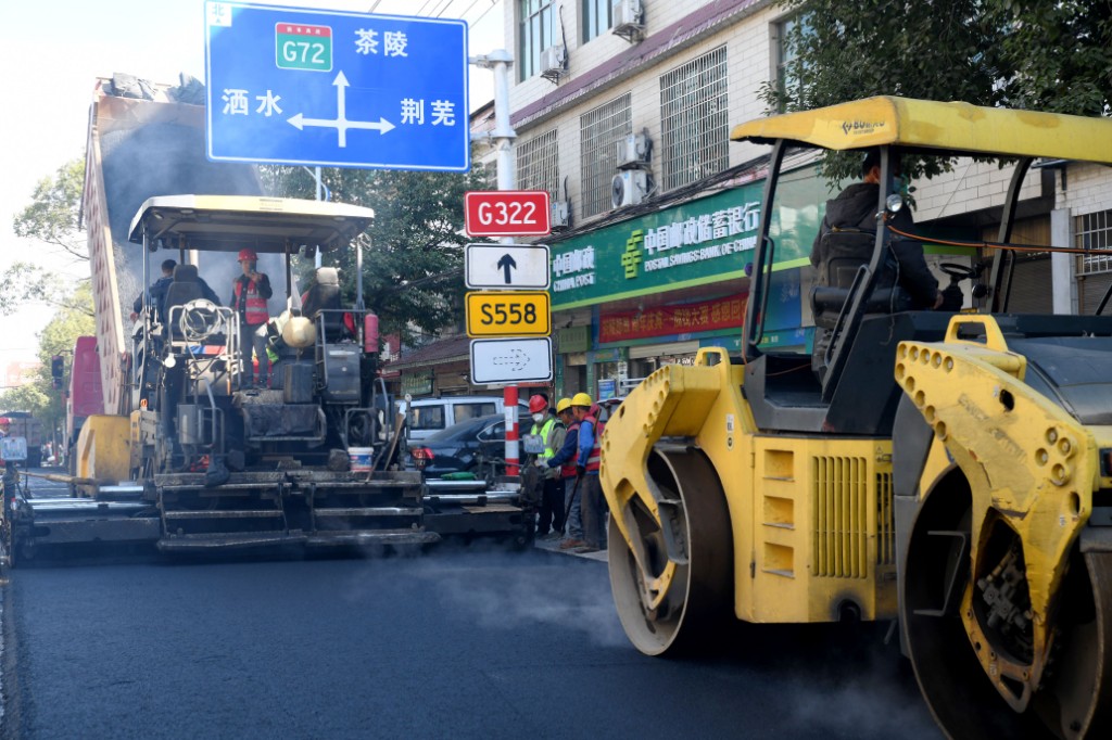 在国道G322线茶陵县枣市镇候泉村段公路,记者看到,施工人员与大型机械设备紧密配合,铣刨机、摊铺机、压路机等施工设备有序运转,对破损路面进行铣刨、清理后,铺设新的沥青混凝土面层,并碾压到位。